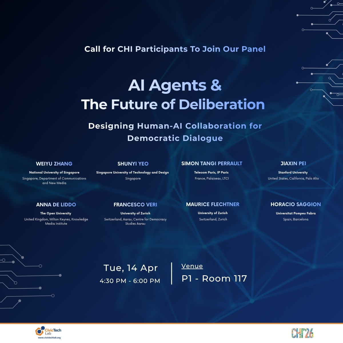 Panel: "AI Agents and the Future of Deliberation: Designing Human–AI Collaboration for Democratic Dialogue." Weiyu Zhang, Simon Perrault, Anna De Liddo, Francesco Veri, PhD, Maurice Flechtner, Horacio Saggion, Kaiyao Zhuang will discuss various initiatives using AI in deliberation and organize a debate among the audiences. Time: Tue, 14 Apr | 4:30 PM - 6:00 PM; Venue: P1 - Room 117. More information here: https://programs.sigchi.org/chi/2026/program/content/221865